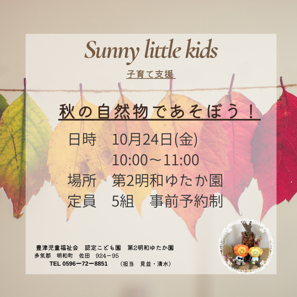 2025年10月7日 未分類 10月の子育て支援事業のお知らせ 子育て支援事業の日程が決まりましたのでお知らせいたします。 毎月1回未就園児を対象に子育て支援事業を行っています。 10月24日(金) 10時~11時です。 事前予約制ですので、参加を希望される方は、園までお問い合わせください。